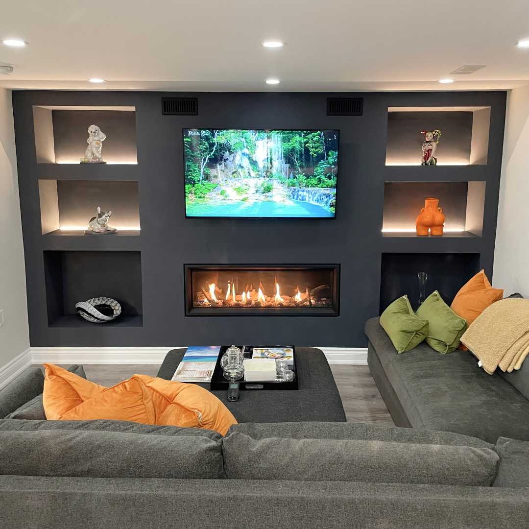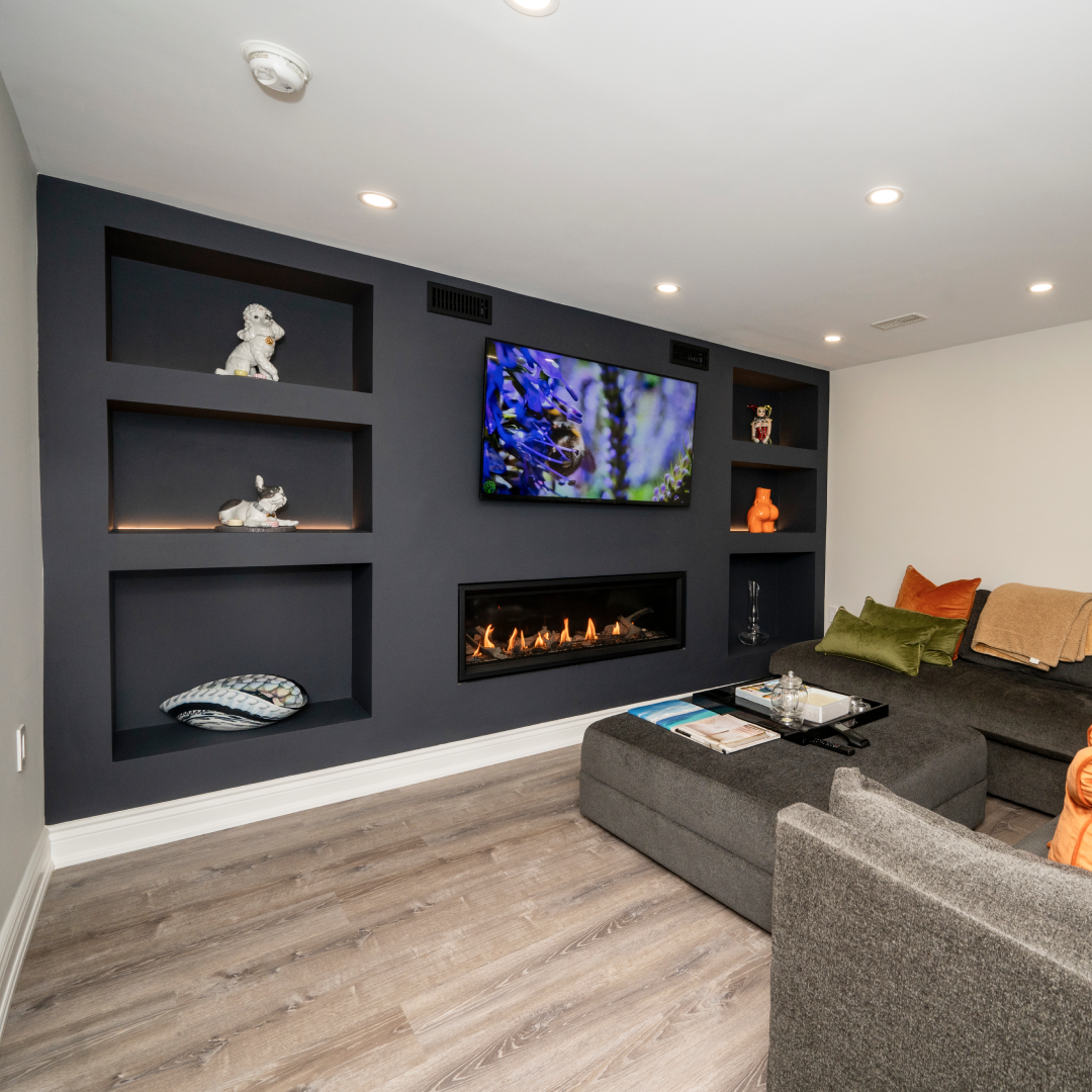 Basement Renovation Project: The central feature of this endeavor was a wall unit housing a TV and fireplace, creating a cozy and contemporary ambiance throughout the space.